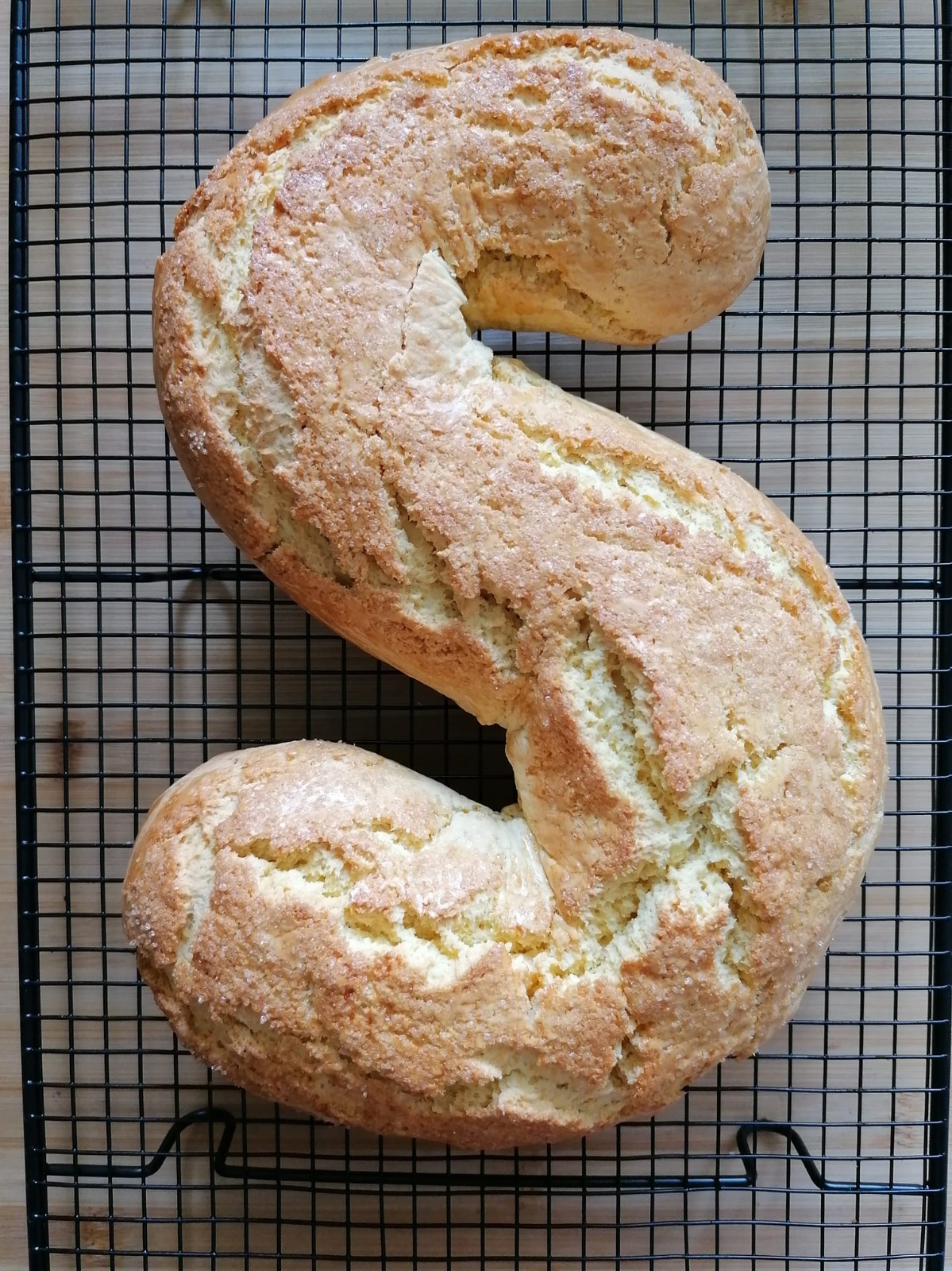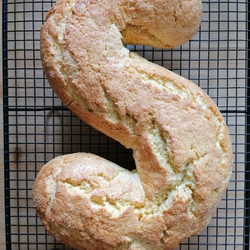 Formate un filone lungo e, dopo averlo leggermente inumidito, passatelo nello zucchero a granella per una copertura uniforme. Un metodo semplice è spargere lo zucchero sulla superficie di lavoro e far rotolare l'impasto sopra di essa.